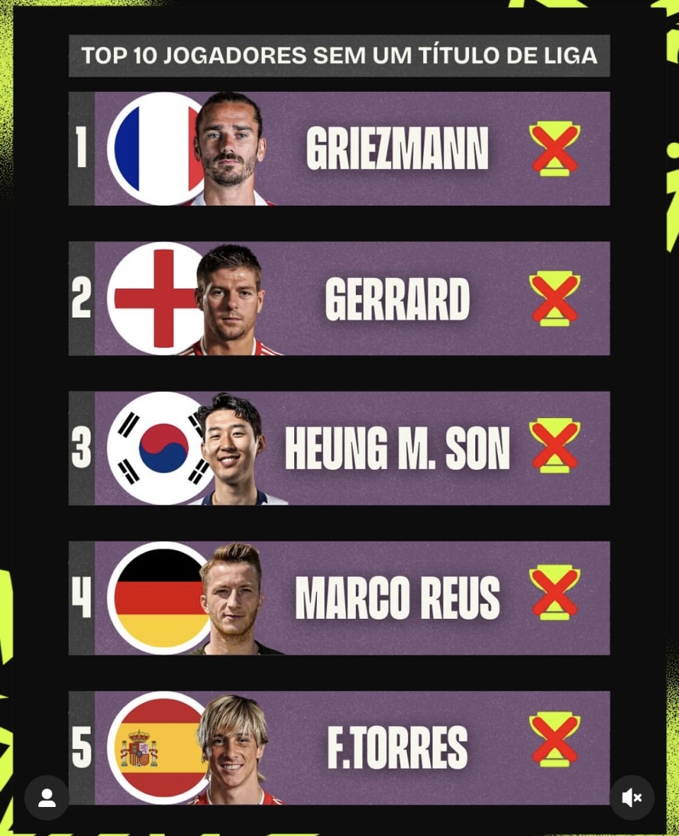 没有联赛冠军十大球员:格里兹曼排名第一?托雷斯排名不如孙兴慜